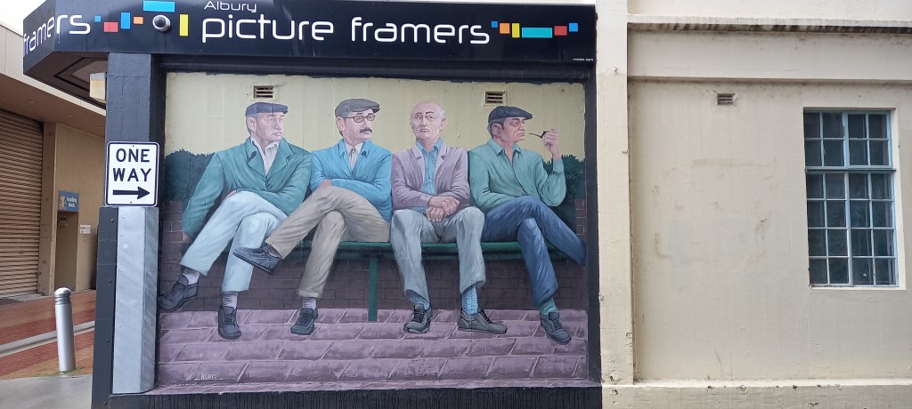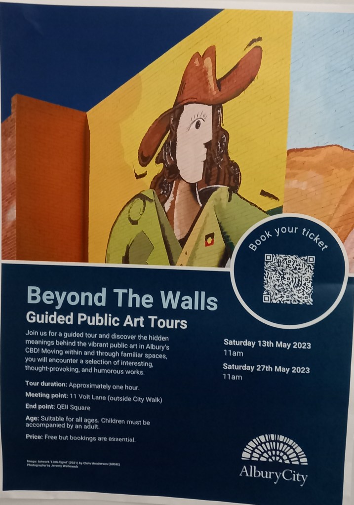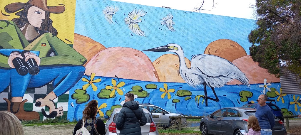 Organised by the local council, the Beyond the Walls: Public Art Tour ran on two successive weekends. The Saturday morning I attended in May 2023 was bitterly cold, nevertheless an eager collection of people assembled in Volt Lane which runs parallel to Albury’s main street, Dean Street. We were called together beside Nat Ward’s ‘Inland Waterways.’ A digitised version of this local artist’s painting was turned into a vinyl wrap in 2016 and transforms the eyesore of an electrical substation into a place of interest.